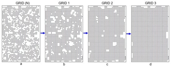 The stages of complementing the GRID node structure in successive iterations are shown in Figure 7. In the presented process, a resulting set of nodes (GRID 1—Figure 6d and Figure 7b) is generated in the first iteration based on the original resource (GRID (N)—Figure 6a and Figure 7a). This set becomes the source set for the next iteration (Figure 5). The location parameters defined in the introduction of the modules [UGX] and [UGY] can remain the same for all iterations. However, maintaining the same processing parameters (a maximum of one missing node) for successive iterations does not result in the full complementation of the missing gaps in the GRID structure (Figure 6a). Therefore, the entire processing process needs to be repeated for differently defined location parameters. The next iteration established three nodes before the found gap and three nodes behind this gap (as the data for polynomial determination), and a maximum of two newly determined nodes to be complemented in the row and column in the newly created GRID structure. The result of running the [UGX], [UGY], and [UXY] module sequence with the node location parameters defined in this manner enabled the generation of a GRID 2 network of nodes (Figure 7c) in the next iterative process (Figure 5).