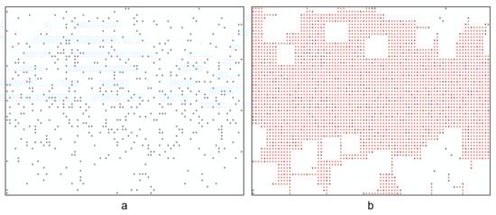 Moreover, with a large number of missing nodes, it is not always possible to obtain a complete GRID structure. Setting a large value of the maximum gap tolerance (the number of nodes to be complemented) with large gaps in the original structure creates areas in which generating the missing nodes is not possible. Figure 8a shows an incomplete grid of nodes (black colour), while Figure 8b shows the complementary structure (red colour). Setting the maximum tolerance at the level of seven nodes to be determined in the newly created GRID structure did not allow a complete grid to be generated due to the gaps in the source set being too large.