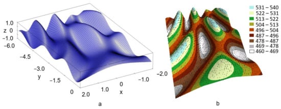 In order to analyse the quality of the models generated using the two methods for determining the missing nodes in the GRID structure (iterative and single-pass), a theoretical model was used, along with several examples of node complementation in the actual surface models. A surface model generated by a function of two variables was used for a comparative analysis of the differences between the practical surface (created by interpolation) and the theoretical surface (determined from the function). This approach allows pseudo-measurement points to be generated at any location and height values to be obtained for them based on the function. Based on these points, a practical GRID structure is generated in the interpolation process and then complemented by the described method. The same function is also used to obtain height values at the locations where the nodes of the theoretical GRID structure will be determined. A comparison of values between the nodes of the practical and theoretical structure is used to analyse the fit of both surfaces and determine the accuracy. In order to create a theoretical model, the function of two variables (5) was used, on the basis of which the surface forming a theoretical test model shown in Figure 9a was generated.