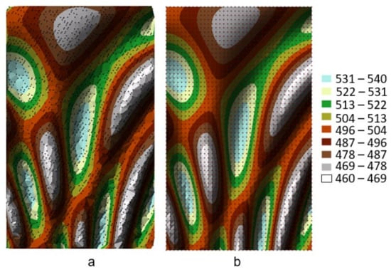 The GRID structure nodes were then interpolated using such a resource of pseudo-measurement points. The grid resolution (the spacing S between the nodes) was set at 10 m, and the search for pseudo-measurement points for interpolation was performed within a radius of 15 m. Four sectors were used as the method for searching points for the interpolation, while for the interpolation, an algorithm using radial basis functions was used [70,71]. In the resulting file of the interpolation, only the nodes with correctly located pseudo-measurement points were retained, while the remaining nodes were rejected. The reduced number of pseudo-measurement points prevented the determination of values at all the nodes, and finally, an incomplete GRID (N) node structure shown in Figure 7a was created. The interpolation model created on the basis of GRID (N) is shown in Figure 11a. In order to compare the quality of the models, the model generated on the basis of the theoretical node structure (GRID (T), S = 10 m), used for the processing accuracy check, is shown in Figure 10b.