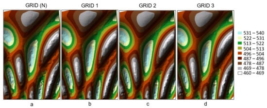The following figures (Figure 11) show interpolation models generated on the basis of a successively complemented GRID structure in the process of previously described iterative processing methodology. The surface models from Figure 11a–d correspond to the successive node structures presented in Figure 7a–d. The presented iterative processing process performs, in successive steps, the successive approximations of the surface under analysis, which contributes to the generation of increasingly better models. This results from the fact that, in each successive step of iterative processing, the structure is complemented with a small number of nodes resulting from the defined processing parameters. Checking on the acceptable gap between the nodes (in each row and column of the newly created structure) while performing the successive iterations enables the increase in the accuracy of the finally generated model in relation to the model created on a single-pass basis.