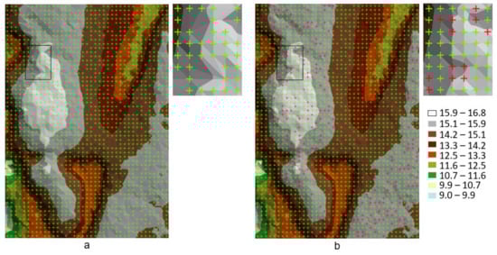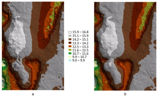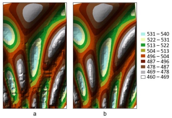 In order to compare the quality of models created by the single-pass and iterative method, Figure 15 shows two surface models generated on the basis of the same incomplete GRID structure (Figure 14a). In the first case (Figure 15a), DTM was generated on the basis of the original GRID structure complemented to a complete grid with nodes determined in a single cycle (on a single-pass basis). In this case, the described [UGX] and [UGY] modules were used, for which the determination of any number of the missing nodes in each column (X axis) and row (Y axis) was established. What can be noticed are the local distortions of the surface, particularly in zones of high morphological diversity. In the second case (Figure 15b), the model was generated in three iterative cycles (Figure 5) in stages with the previously described parameters (Figure 7). An improvement in the model quality is particularly noticeable in the zones with diverse local height differences.
