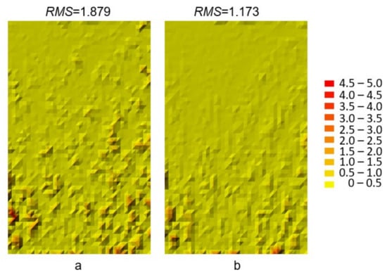 A comparison of the models generated on the basis of the same incomplete GRID structure at different processing parameters is presented in Figure 12. In the first case, the model was generated by the single-pass method, where an arbitrary number of missing nodes in columns and rows were defined (Figure 12a). This enables the model to be generated very efficiently while reducing its accuracy. The model generated in this manner shows local distortions, located in particular in the most morphologically diverse area. However, low-diversity areas are characterised by small deformations. This method can be applied to surfaces with small local height differences where it is sufficiently accurate. In the second case (Figure 12b), the model was generated by the iterative methods, which checked the size of acceptable gaps in the structure of nodes in each cycle (according to the workflow shown in Figure 5). This ultimately allowed a more accurate model to be obtained, particularly in an area with greater morphological diversity.