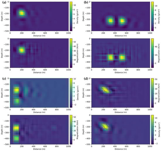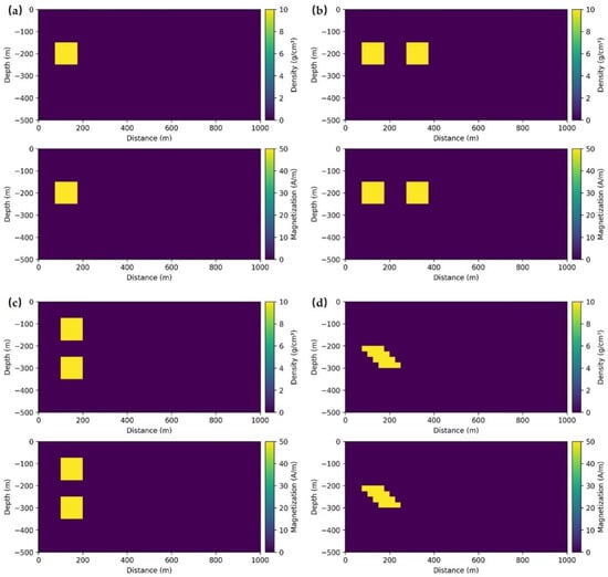 Training set samples with anomaly bodies with density of 10 g/cm3 and a magnetization intensity of 50 A/m, (a) single rectangular anomaly body, (b) two rectangular anomaly bodies distributed horizontally, (c) two rectangular anomaly bodies distributed vertically, and (d) one stepped anomaly body.