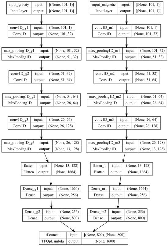 In using GMNet machine learning, the detailed architecture is shown in Figure 3. Figure 3 shows how GMNet is implemented. The model has two input layers, one for receiving gravity observations and one for magnetic observations. Each input layer is shaped (101, 1). The processing of gravity and magnetic data includes three convolutional and pooling layers, a flattening layer, and two dense layers, respectively. Finally, there is a tf.concat layer.