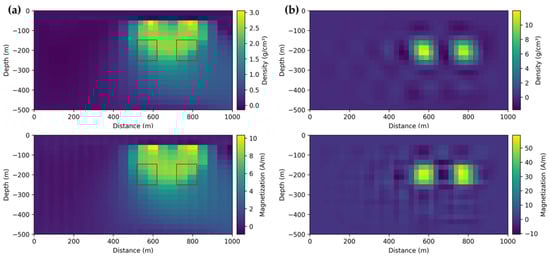 To assess the inversion performance of the GMNet-based joint inversion method for gravity and magnetic fields, we applied the method to invert an underground model featuring two anomalous bodies with a density of 10 g/cm3 and a magnetization intensity of 50 A/m. A comparative analysis was conducted with the results obtained from the gravity and magnetic cross-gradient joint inversion method, a purely model-based joint inversion algorithm. In our implementation, we utilized only its two-dimensional form, extending the underground model region and the number of anomalous bodies. The initial inversion model was set as an underground space with a density of 1 g/cm3 and a magnetization intensity of 1 A/m. We performed 300 iterations, taking approximately 5 min. Figure 6 illustrates the inversion results of the two methods, with the true position of the anomalous body marked by a red box. Figure 6a displays the inversion results obtained using the cross-gradient-based joint inversion method, while Figure 6b presents the results obtained using the GMNet machine learning method. The first method yielded inversion results with lower density and magnetization values than the true values, accompanied by a blurred position of the anomalous body. In contrast, the second method demonstrated effective inversion results in less than a second. Data-driven methods, such as GMNet, exhibit the advantage of not requiring an initial inversion model and can achieve superior inversion results with minimal computational time.
