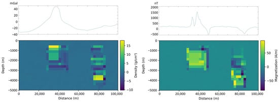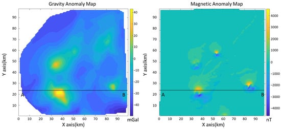 The actual data used in this study are from the central–southern region of Jussara, Goias State, Brazil. The Bouguer gravity anomaly and total magnetic anomaly of the region are depicted in Figure 8. We selected the observation data from traverse line AB for inversion using the GMNet machine learning method. Traverse line AB is approximately 10,000 m long, and due to the limited number of measurement points, we interpolated it to obtain 101 observation points spaced at 100 m intervals. These data were processed to meet the requirements of GMNet. The network architecture and parameter settings remained the same as before. Considering the various uncertainties in real data, and to mitigate the impact of underground model parameter variations on the inversion results, we modified the training samples used for network training. We extended the previously used 1300 training samples to a larger subsurface space, with a length of 100,000 m and a depth of 5000 m. Similarly, the underground two-dimensional space was set as 800 (20 rows × 40 columns) rectangular cells, but each cell had a length of 2500 m. The distribution and shape of these samples did not change significantly. In addition, to enhance the accuracy of the inversion results, we generated 640 additional sample sets with the same scale of the samples intended for the prediction for network training. The training time was approximately 30 min, and the prediction time was less than 1 s.