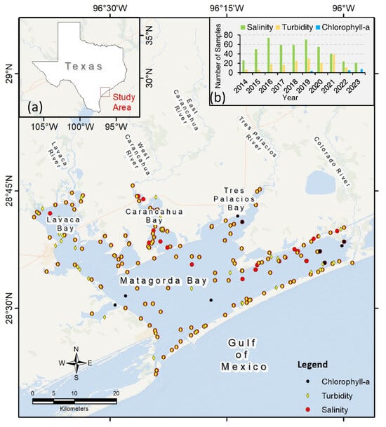 The spatial distribution of Matagorda Bay along the Texas Gulf Coast, and the locations of the in situ WQIs measurements used in this study. (a) The location of the study area along the Texas coast. (b) The yearly distribution of in situ WQI measurements during the study period (2014–2023).
