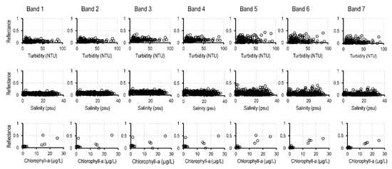 Scatterplots of turbidity (top panel), salinity (middle panel), and chlorophyll-a (bottom panel), and Landsat-8-derived surface reflectance data at each band (B1–B7).