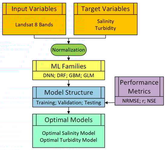 For both turbidity and salinity, the input data for the ML models comprised seven Landsat-8 bands (Figure 3). The organization of the input data aimed to facilitate a more straightforward comparison between ML and empirical models. Due to the limited data availability, ML models were not created for chlorophyll-a.