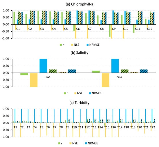 Performance statistics for (a) chlorophyll-a, (b) salinity, and (c) turbidity uncalibrated (solid colors) and calibrated (dashed lines) empirical models. Note the y-axis is fitted to ±1 for display purposes; actual higher and lower values are listed in Table 4.