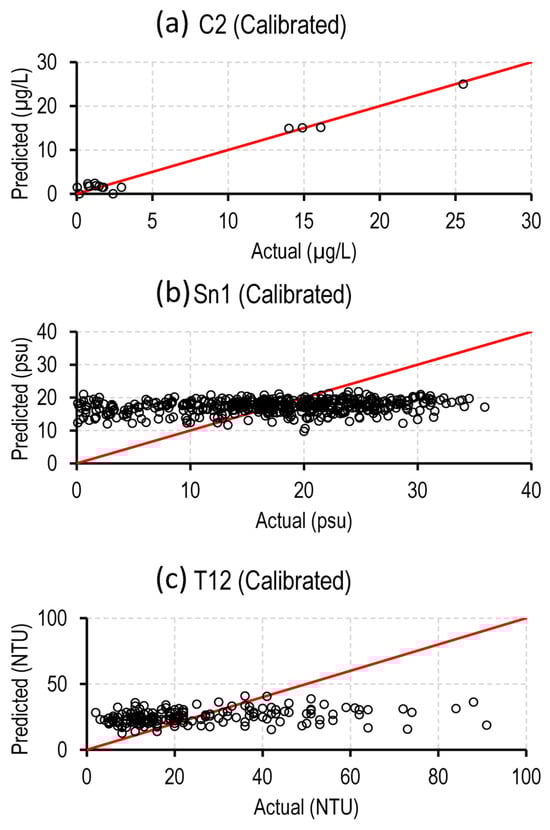 Figure 4 and Table 4 present the performance metrics of the 36 uncalibrated and calibrated empirical models implemented in this study. Performance varied in the 12 uncalibrated empirical chlorophyll-a models (Figure 4a; Table 4), with the NRMSE ranging from 0.32 to 1475.10, r from −0.88 to 0.96, and NSE from −23,527,276.57 to −0.12. Among these uncalibrated models, model C8 had the highest performance, based on NSE values, (NRMSE: 0.32, r: 0.65, NSE: −0.12); model C7 displayed the lowest performance (NRMSE: 1475.10, r: 0.80, NSE: −23,527,276.57) (Figure 4a; Table 4). Statistical assessments of the uncalibrated chlorophyll-a models indicate poor performance (NRMSE: 126.91 ± 424.70, r: 0.42 ± 0.67, NSE: −1,961,890 ± 6,791,336). After calibration over Matagorda Bay, the chlorophyll-a models demonstrated enhanced performance (NRMSE: 0.91 ± 0.03, r: 0.94 ± 0.04, NSE: 0.89 ± 0.06). These calibrated models also demonstrated comparable performance when compared to one another (Figure 4a; Table 4). The NRMSE for the calibrated models ranged from 0.85 to 0.96, with corresponding r values from 0.88 to 0.99 and NSE values from 0.88 to 0.98. Notably, calibrated model C2 exhibited the highest performance (optimal model) with NRMSE, r, and NSE values of 0.96, 0.99, and 0.98, respectively. A scatterplot of the calibrated model C2 demonstrates an overall acceptable performance (Figure 5a). Calibrated model C9 displayed the lowest performance, with NRMSE, r, and NSE values of 0.85, 0.88, and 0.77, respectively.