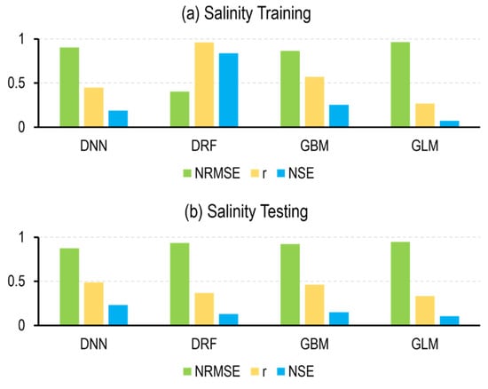Performance metrics for optimal salinity models derived from different ML model families (e.g., DNN, DRF, GBM, GLM). Metrics are displayed for (a) training and (b) testing phases.