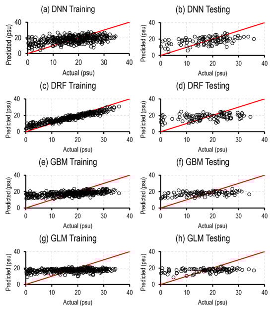 Following DNN closely in performance, GBM ranks as the second best performing family. The optimal GBM model, showcased training performance metrics of NRMSE: 0.86 ± 0.04, r: 0.57 ± 0.07, and NSE: 0.25 ± 0.07, and testing performance metrics of NRMSE: 0.92 ± 0.03, r: 0.46 ± 0.10, and NSE: 0.15 ± 0.07. DRF presents a slightly weaker performance, being the second least effective family. The optimal DRF model exhibited a training performance of NRMSE: 0.40 ± 0.01, r: 0.96 ± 0.00, and NSE: 0.84 ± 0.01, and a testing performance of NRMSE: 0.93 ± 0.04, r: 0.37 ± 0.08, and NSE: 0.13 ± 0.08. Finally, GLM ranks as the least proficient model. The optimal GLM model resulted in a training performance of NRMSE: 0.96 ± 0.01, r: 0.27 ± 0.02, and NSE: 0.07 ± 0.01, and a testing performance of NRMSE: 0.95 ± 0.03, r: 0.33 ± 0.08, and NSE: 0.10 ± 0.05. Overall, these results underscore the superiority of DNN, GBM, and DRF for salinity simulation while highlighting the limitations of GLM (Figure 6; Table 5). Figure 7 presents scatterplots illustrating observed and modeled salinity values generated for the optimal model in each ML family during both the training and testing phases. As depicted in Figure 7, the DRF model is performing well during training compared to other models.