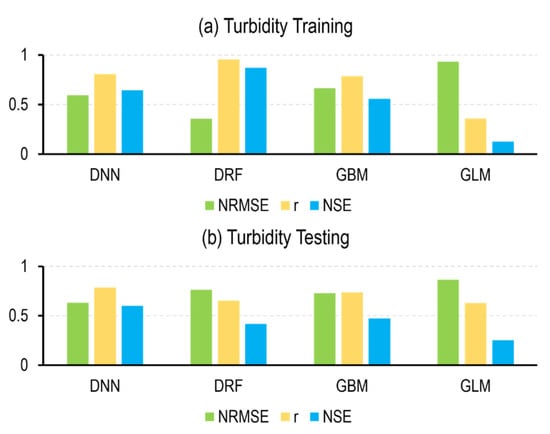 To prevent overfitting in each model, early stopping criteria were enforced, employing the mean-squared error as the stopping metric. This involved setting a stopping round value of 5 and a stopping tolerance of 0.0001. This option specifies the tolerance value by which an ML model must improve before training ceases. In this case, the moving average for last six simulation rounds is calculated, where the first moving average is the reference value for comparison with the other five moving averages. The model will stop training if the ratio between the best moving average and the reference moving average is more than or equal to 0.0001. These stopping options are used to increase model performance by restricting the number of models that are built. To improve the simulation accuracy, we ran each simulation for 50 runs. The model with the highest testing performance, based on the Nash–Sutcliffe efficiency (NSE) coefficient, was selected as an optimal model. An optimal model was selected for salinity and for turbidity from each ML model family (e.g., DNN, DRF, GBM, and GLM) (Figure 3).