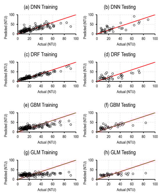 Figure 8 and Table 5 present the optimal turbidity models from the various ML families. All DNN, GBM, and DRF turbidity models demonstrated closely competitive performances. The optimal DNN model achieved a training performance of NRMSE: 0.59 ± 0.13, r: 0.81 ± 0.06, and NSE: 0.65 ± 0.11, and a testing performance of NRMSE: 0.63 ± 0.11, r: 0.79 ± 0.11, and NSE: 0.60 ± 0.20 (Figure 8; Table 5). The most significant input variables for this model were B4, B5, B3, B7, and B1. The relative importance for these inputs were 20%, 16%, 14%, 14%, and 14%, respectively. The GBM family provided the second-best performance. The optimal GBM model has a training performance of NRMSE: 0.66 ± 0.17, r: 0.79 ± 0.07, and NSE: 0.56 ± 0.14, and a testing performance of NRMSE: 0.73 ± 0.10, r: 0.73 ± 0.13, and NSE: 0.47 ± 0.20. The performance of the DRF was slightly weaker than the DNN and GBM families. The optimal DRF model produced training performances of NRMSE: 0.36 ± 0.02, r: 0.95 ± 0.01, and NSE: 0.87 ± 0.01, and testing performances of NRMSE: 0.76 ± 0.10, r: 0.65 ± 0.11, and NSE: 0.42 ± 0.18. Once more, the GLM family produced models with the lowest performance. The optimal GLM model produced training performance metrics of NRMSE: 0.93 ± 0.03, r: 0.36 ± 0.08, and NSE: 0.13 ± 0.05, and testing performance of NRMSE: 0.86 ± 0.07, r: 0.63 ± 0.16, and NSE: 0.25 ± 0.14 (Figure 8; Table 5). Figure 9 depicts scatterplots that illustrate the relationship between the observed and modeled turbidity values produced by the optimal model from each ML family during both the training and testing phases. All model families tend to overpredict turbidity values during the training phase. The performances of the DNN, GBM, and DRF models are close for both training and testing.