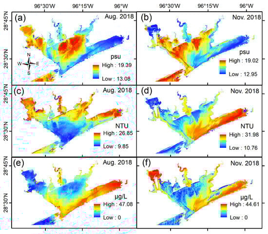 Modeled WQI data produced using optimal salinity, turbidity, and chlorophyll-a models over Landsat-8 images acquired on (a,c,e) 22 August 2018 and (b,d,f) 26 November 2018.