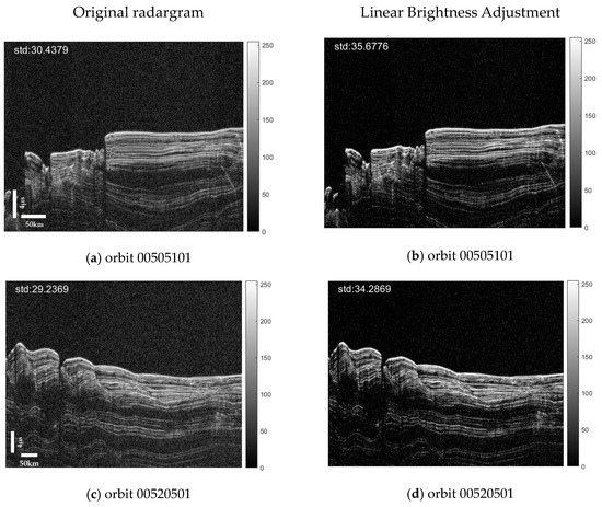 The radargrams of orbit 00505101 and orbit 00520501 were used to evaluate the effect of the linear brightness adjustment. The standard deviation is an important indicator for measuring the distribution range of image pixel values. A higher standard deviation usually means that the image has a higher contrast. Figure 3b,d show the processed images, while Figure 3a,c show them after a linear brightness adjustment, with a significant increase in the standard deviation and contrast compared to before processing.