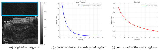 We performed the denoising process on the radargram of orbit 00505101 as shown in Figure 4a. The upper blue box outlines the non-layered region for the computation of average variance, which included random noise, as shown in Figure 4a. Figure 4b shows that the average variance rapidly decreased in the first eight iterations and then stabilized, indicating that the denoising level in this region was gradually converging [19]. Therefore, in terms of denoising, for the first eight iterations the noise continued to decrease, and the noise level tended to stabilize after eight iterations. Figure 4c shows that the average contrast value decreased by more than 50% after seven iterations. If the iterations continued, the layered information would be lost [18], which would further affect the accuracy of the subsurface reflector detection. Therefore, in this study, the number of iterations was set to seven.
