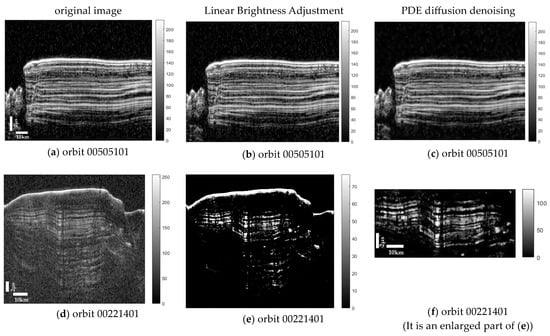 Based on the runtime and image quality, it is necessary to choose an appropriate number of iterations. The unified selection of iteration times for this study was seven. The final preprocessed image is shown in Figure 5, taking orbit 00505101 and orbit 00221401 as examples, and they of the NPLDs and the SPLDs, respectively. Among them, (a) and (d) are the original graphs, (b) and (e) are the graphs after linear brightness adjustment, and (c) and (f) are the partial enlarged images after seven iterations of the fourth-order partial differential diffusion equation. It can be observed that the noise in (b) and (e) was significantly removed, while in (c) and (f) there was a further removal of the noise while image details were maintained.