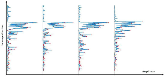 where the local window is set to 30 [21]. The peak detection function is used to detect the peak of the sequence C. For the detected peak values, the standard deviation is calculated as the threshold to remove false peaks. The filtered results of Figure 6 are shown in Figure 7, which indicates that the peak points extracted underground were screened.