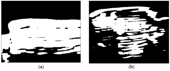 The KL divergence of S and N was then computed. The higher the KL divergence value, the greater the difference between the actual distribution S and the non-layered area distribution N, indicating a greater likelihood of being a layered area. Based on the final KL value, a threshold process generates a binary encoded map to determine the presence of subsurface reflectors, as per Equation (17). Through some experiments, we determined the threshold as 50, and Figure 8 shows the binary encoded map.