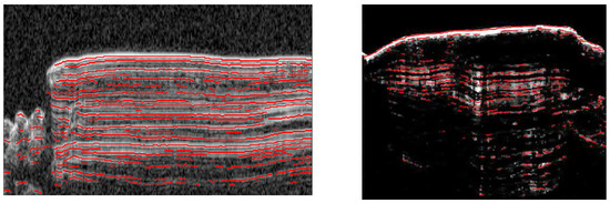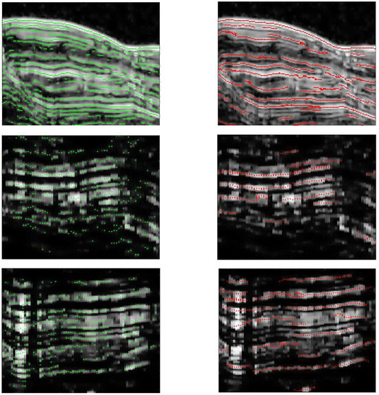 The above comparison of images and quantitative evaluation metrics demonstrates the effectiveness of our new algorithm. (1) Through threshold filtering, it retains valid peak points and discards most non-stratified peaks, thereby enhancing the accuracy. (2) Unlike traditional line detection methods, such as the Steger algorithm [27], this algorithm is based on peak detection, allowing it to identify weak reflective layers. (3) As shown in Figure 13, there is an improvement in continuity compared to [12]. (4) Compared with [13], the missed detection rate decreased significantly.