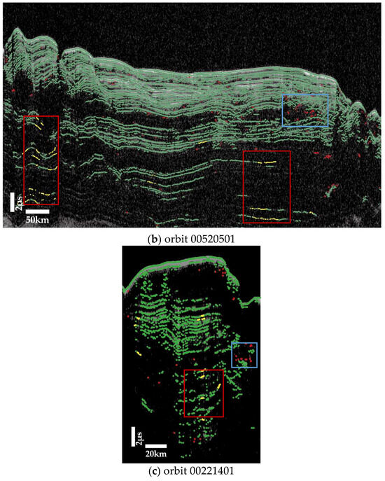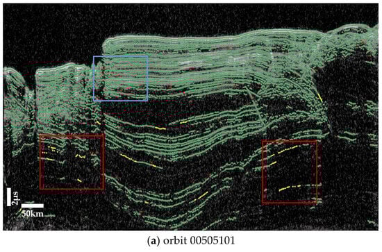 Figure 11 shows the detection results of three SHARAD radargrams, where Figure 11a,b are NPLDs, and Figure 11c shows SPLDs. The basal unit structure of the Martian North Pole generally exhibits some ambiguous areas on the radargrams, such as the bottom region of Figure 11a,b. These basal structures are not the stratified structure, and this algorithm accurately neglected them. Some missed detections of deeper layers, marked in the red box, were mainly due to the lower SNR (signal-to-noise ratio), and some false detections of shallow layers, marked in the blue box, were mainly due to the smaller interval. The interlayer spacing in the image was minimized to an interval of approximately five pixels. Moreover, Figure 11c indicates that both the miss rate and false detection rate in the SPLDs region were higher than in the NPLDs region. The reason is that SHARAD images of the SPLDs often display near-surface scattering phenomena, creating a diffuse, fog-like appearance that obscures the underlying reflective stratified layers [29]. Additionally, the radar attenuation losses in the SPLDs were significantly greater than those in the NPLDs [29], resulting in large areas of white, blurred brightness in the images, as in Figure 12. In terms of peak detection, the lower signal-to-noise ratio (SNR) in the SPLDs was due to a problem with the orbital data [30], which in turn led to increased missed and false detection rates.