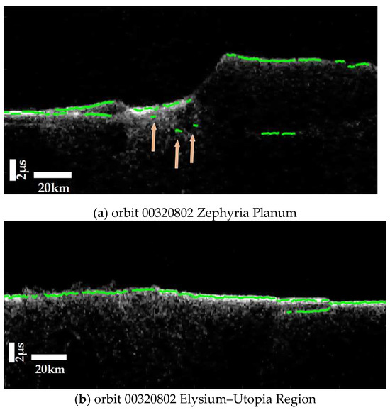 To test the applicability of this algorithm in other regions of Mars, two orbiter’s radargram images in mid-latitude areas were tested. Figure 15a shows the detection result of orbit 00320802 in Mars’s Zephyria Planum [17], and Figure 15b shows the detection result of orbit 00320802 in the Elysium–Utopia Region [31,32]. The assessment explicitly excluded areas with more ambiguous subsurface structures. Although there were some false detections at the locations indicated by the arrows, the subsurface layers were still accurately detected, as shown in the Figure 15. This demonstrates the algorithm’s applicability and value in non-polar regions of Mars.