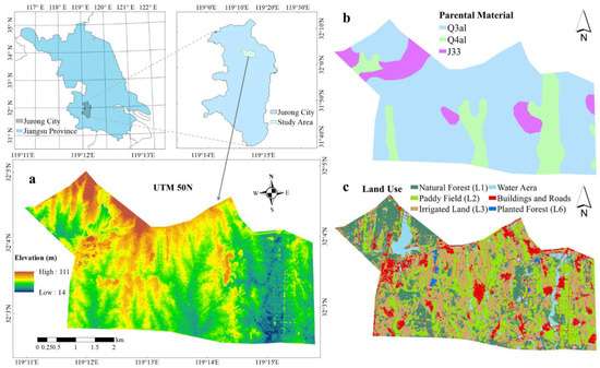 The study area is located in the northern part of Jurong City, Jiangsu Province of China, which is a hilly agricultural region with a total area of about 2150 ha (Figure 1). The study area has a north subtropical continental monsoon climate, with an average annual temperature of 15.2 °C and an annual precipitation of 1060 mm. The soil-forming parent material (PM) is mainly tertiary alluvial parent material (Q3al), quaternary alluvial parent material (Q4al), and a small amount of purplish sandstone (J33). Cultivated land and forests are the main land use types, and there are a few natural forests and planted forests.