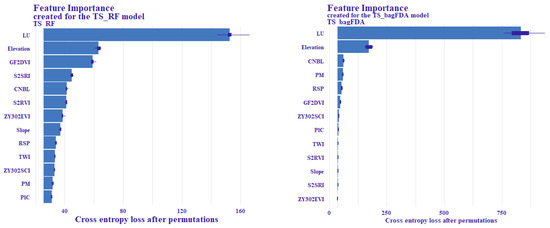 In order to better understand the influence of each environmental factor on the soil type, the importance of variables was analyzed for the two best-performing models. As shown in Figure 4, cross-entropy was chosen as a performance indicator to rank the importance of the variables. Considering the uncertainty of the evaluation, more than 10 evaluations were performed and sorted by their means. LU and elevation are the dominant variables in both models, and the absence of LU can significantly increase the cross-entropy of the models, indicating that LU has the highest variable importance, followed by elevation. This demonstrates that LU and topography are the two dominant factors influencing soil type, which is particularly significant in farming areas with high anthropogenic influence. Moreover, CNBL is the third most important variable due to the consistency of the paddy field and river distribution, a factor that should be focused on in farming areas. In addition, the bagFDA model relies too much on one variable, which could introduce greater instability into the model. The RF model, on the other hand, is relatively less dependent on variables and has a better generalization ability.