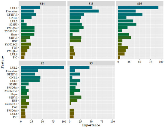 We can conclude that L2 (paddy field) is the most important variable affecting soil classification and plays a decisive role in the prediction of S2 and S16 (dry-farming loess). As L2 is the most anthropogenically influenced type of LU, it is the main soil-forming factor for paddy soils, which leads to L2 being the main environmental variable to distinguish paddy soils (S2 and S5) and yellow-brown earths (S16) in cultivated soils. Moreover, elevation holds the greatest importance in S15 (dry-hard loess) because S15 is generally distributed at relatively high locations, such as the top of a hill or the foot of a slope, making elevation the main environmental variable that distinguishes S15 from other soil types. In addition, GF2DVI, S2SRI, and ZY302EVI also play an important role among the soil types because of the strong correlation between the vegetation index and LU. This also reflects the fact that multi-temporal images can differentiate soil types based on the phenological changes of vegetation and have a good application prospect in soil classification.
