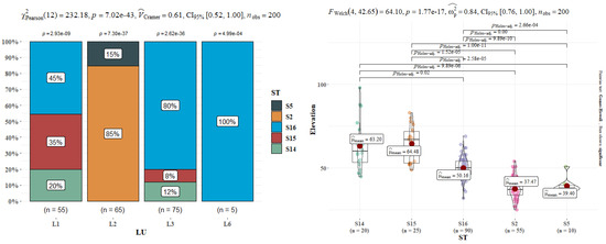 In this study, a chi-squared test and analysis of variance were also performed on the first two important variables (LU and elevation) based on typical samples (Figure 6). The p values of LU and elevation were close to 0, and the p values of L2 and L3 were very small, which have an important impact on soil classification. In addition, the effect values of LU and elevation reached 0.61 and 0.84, respectively, so we can infer that elevation has better robustness in ST prediction, and LU has a slightly worse effect in areas less affected by human influence, but it still has a high effect size (0.61). In particular, elevation has a high significance among various soil types except for S2 and S5 (S14 (yellow sand soil) and S15), which is consistent with the above analysis results and also shows that elevation has an important indicative role in soil classification.