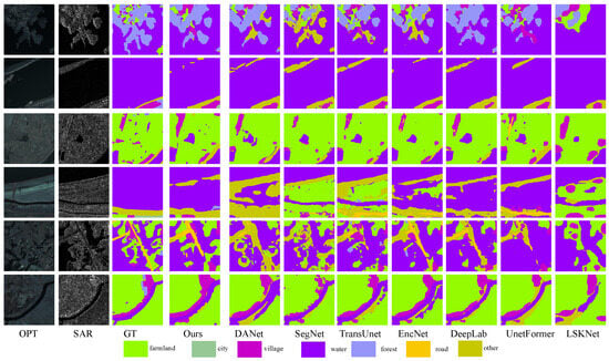 - DANet [40]: This approach employs a dual-stream network, extracting features independently from SAR and optical images. It models semantic interdependencies on both spatial and channel dimensions by attaching two types of attention modules to the expanded fully convolutional network (FCN).