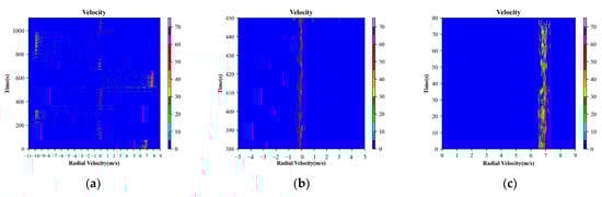 Radar monitoring and analysis of the velocity state of the UAV. (a) The whole process; (b) hover; (c) 7 m/s; (d) −10 m/s; (e) 8 m/s; (f) −10 m/s.