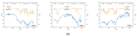 We analyze the data in detail in Table 7. Analyzed from a quantitative point of view, the maximum deviation at +7 m/s was 0.04 m/s and the minimum deviation was 0.02 m/s; the maximum deviation at +8 m/s was 0.22 m/s and the minimum deviation was 0.04 m/s. This is because when the UAV is working at lower velocities, the reference velocity variations are minimal, resulting in a larger continuous and stable data period. This increases the reliability of the reference values during synchronous comparisons. Conversely, at a velocity of −10 m/s, the minimum deviation was no greater than 0.05 m/s, and the maximum deviation approached 0.5 m/s. This is attributed to the inadequate stability of the UAV internal state at high velocities, resulting in abrupt changes in adjacent velocity reference values of approximately ±0.5 m/s. Moreover, the maximum deviation could potentially include a systemic bias associated with velocity discontinuity. Therefore, this study optimizes traditional validation assessment methods by using the minimum deviation between the measured and reference values of the UAV velocity as the evaluation criterion for optimal absolute accuracy. It can effectively reduce the inspection error introduced by the system deviation of the UAV. At the same time, even when the UAV was in a relatively unstable high-velocity state, the relative accuracy of the radar radial velocity validation remained less than 0.2. Furthermore, the optimum absolute accuracy of synchronous comparisons between the UAV and radar was no greater than 0.05 m/s. This conclusively demonstrates that weather radar radial velocity validation based on the RTK UAV can quantitatively reflect the radar velocity measurement capabilities and that the method has good robustness.