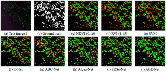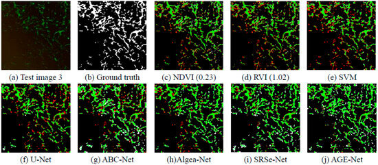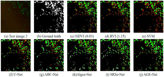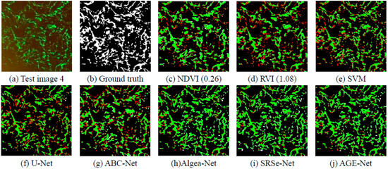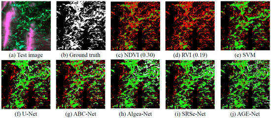 We compared our proposed method with traditional methods for extracting green tides, including the normalized difference vegetation index (NDVI), ratio vegetation index (RVI), and support vector machine (SVM) [35]. Through multiple experiments on the test images, the optimal thresholds for NDVI and RVI were determined to be 0.05 and 1.10, respectively, with the optimal threshold obtained by the OTSU method. In addition, we compared the proposed method with current popular deep learning methods, including U-Net [36], ABC-Net [37], Algae-Net [29], and SRSe-Net [32]. For each model, we used the same training strategy to ensure fairness.