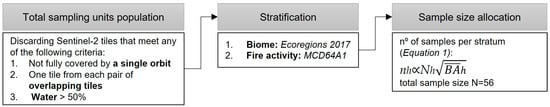 Following the good practices on accuracy assessment [], the sampling design to create the S2RP dataset was based on probability sampling, using a stratified random sampling design. The methodology used to select the sample units (Figure 1) begins with the identification of the tiles suitable to be used as sampling units, as they ensure robust statistical sampling, considering the Sentinel-2 tiling grid system []. Subsequently, stratification according to the corresponding biome and fire occurrence was made. Finally, a random selection of the stratified sampling units was applied after defining the number of sample units to be sampled among strata [].