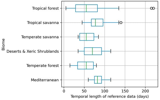 Temporal length distribution of generated reference data in days across different biomes. The box extends from the Q1 to Q3 quartile values of the data and the green line is the median value (Q2). Whiskers extend to 1.5 times the interquartile range (Q3–Q1), and the circles are outliers.