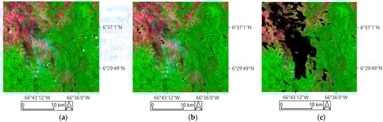 Example of cloud masking for a central region of the 19NGH tile, on 10 January 2019. The masked regions are those areas in black. (a) The image without masking (the darkest zones are cloud shadows); (b) the same image masked employing B1 threshold; and (c) the image masked based on Roteta et al. (2021) [], utilizing the Scene Classification Layer (SCL).