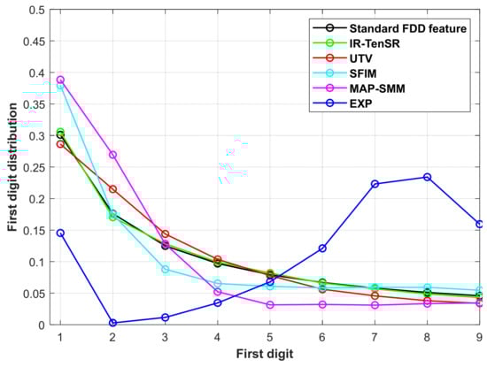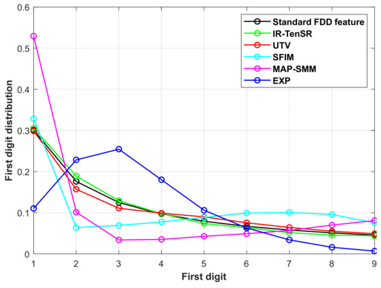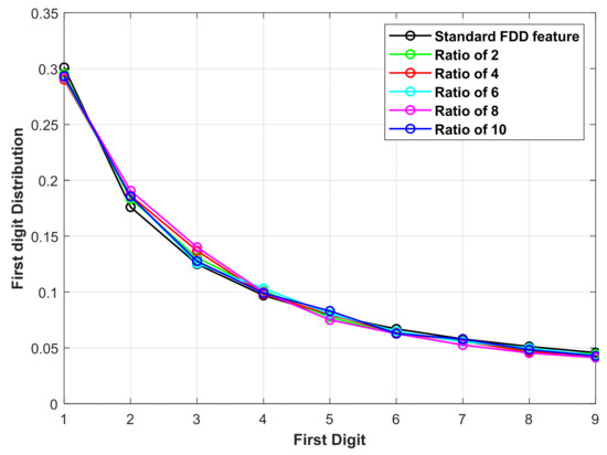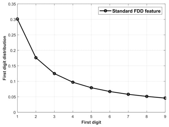 where records the FDD feature of the first digit being n. The standard Benford’s law can be represented by a nine dimensional FDD feature, i.e., [P(1), P(2), …, P(9)]. The standard FDD feature is denoted as FDDstd in (5) and the first digit distribution is plotted in Figure 3.