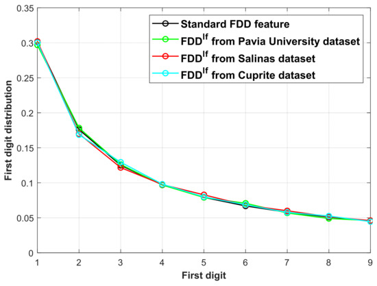 It is assumed that the FDD features extracted from the ideal fusion products should conform to the standard Benford’s law as much as possible, so that the standard FDD feature FDDstd can be used as the reference model. Fortunately, three quality perception features in high-quality HS image data are found. Through extensive experiments, it is verified that the features comply with the standard Benford’s law and are sensitive to distortions in HS sharpened images.
