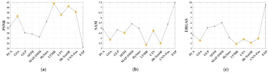 - Comprehensive experiments are conducted to verify the proposed method. The band assignment algorithm is applied to the four NR evaluation metrics of multispectral sharpening, and these adapted metrics are used to evaluate the HS sharpened images. Furthermore, the experiments adopt four commonly used FR evaluation metrics, three HS datasets, and 10 fusion methods to verify the accuracy and robustness of the proposed method.