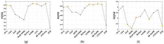 NR quality assessment, also known as full resolution quality assessment, does not have a reference, but instead uses the input images, namely HR-PAN or HR-MS images, as the spatial or spectral references. NR assessment is more in line with practical evaluation processes. Although many NR evaluation methods designed for multispectral sharpening have been proposed, there is little dedicated NR quality assessment method for HS sharpened images. The most widespread NR evaluation metric is QNR [43]. It concerns two distortions: spatial distortion and spectral distortion. The spatial distortion is measured using the difference in the Q values between PAN and MS images at different scales, while the spectral distortion is measured using the change in the Q values among MS bands. There have been some variants and improvements originating from the QNR metric so far. These variants include FQNR [44], RQNR [45], HQNR [46], and GQNR [47], to name a few. Also, some other NR methods have been designed. The quality-estimation-by-fitting (QEF) method predicts the evaluation results via linear regression from the FR evaluation results at different degraded resolution scales [56]. Kalman QEF (KQEF) is subsequently designed to improve the QEF [57]. Moreover, the MVG-based QNR method (MQNR) extracts multiple spatial and spectral features from the fused images to build the distorted MVG model. The distance between the benchmark MVG model and the distorted MVG model is used to indicate the evaluation results [48]. With the help of large-scale datasets, deep-learning-based NR methods have also emerged and been used for PAN-MS fusion quality assessment [49].