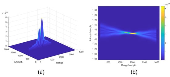 For a solitary moving point target with a known velocity, it is theoretically possible to determine optimal matched filter parameters, thereby attaining comparatively ideal imaging outcomes. To more effectively contrast the imaging capabilities of our proposed method, we calculated the parameters of the matched filter using accurate motion parameters. Then we employed the refined matched filter algorithm on the echo data from Experiment 2, resulting in the imagery shown in Figure 13a, with a variance of 9.2779 × 105.