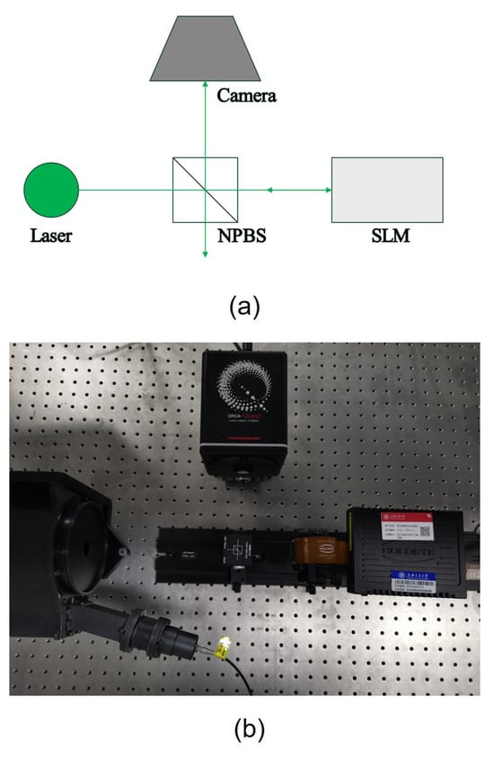 This experiment aims to use an actual optical setup to focus a single-point target. Both a schematic and a photograph of the optical setup are shown in Figure 8. A 532 nm laser was utilized for the experiment. The SLM used is a reflective liquid-crystal-on-silicon modulator from the HOLOEYE brand, with a pixel pitch of 3.74 μm. Owing to the reflective nature of the SLM, the incorporation of a non-polarizing beam splitter (NPBS) is necessary to change the direction of light propagation. The optical path from the camera to the SLM is denoted as .