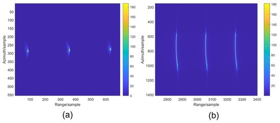 Synthetic-aperture radar (SAR) constitutes an active observation system, offering versatile all-day and all-weather imaging capabilities. Its wide range of applications includes geological exploration, agricultural monitoring, terrain mapping, etc. [,,,,,,,,]. Take geological exploration as an example; SAR is invaluable for its ability to map and analyze Earth’s subsurface structures with precision. Its penetrating radar waves enable the detection of geological features, such as faults and mineral deposits, hidden beneath the surface, offering a vital tool for resource exploration and disaster management. For instance, SAR sensors possess the capacity to detect subtle changes in terrain inclination due to adverse geological formations and can furnish early warning signals of impending collapse several days before a landslide []. The adaptability of SAR extends to various moving platforms, such as aircraft and satellites. By emitting pulses from diverse positions based on the motion of the platform, SAR generates the pulse repetition interval (PRI), which indicates the time interval between two emitted pulses. In SAR, utilizing the relative motion between the radar and the target leads to the formation of a synthetic aperture, thereby enhancing azimuth (parallel to the radar’s motion direction) resolution. Achieving high resolution in the range direction, perpendicular to the radar’s motion, involves the use of transmitted pulse signals, usually as linear frequency modulation signals. Echo data from SAR typically exist in a complex format and are stored in a two-dimensional matrix, where each row encapsulates the echo of an emitted pulse. The purpose of imaging is to reconstruct the backscattering information of the target from the collected data. Given the known nature of the transmitted signal, focusing in the range direction is relatively straightforward and can be achieved using a matched filter. However, the challenge lies in azimuth direction focusing, primarily owing to the complexity of range migration.