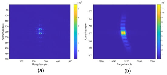 It can be seen that the variance in the images obtained by the optical method is much larger than that of the electronic method, and the larger the variance, the higher the image quality. We also calculated the peak-to-sidelobe ratios (PSLRs) for Figure 9a,b, which are −12.98 dB and −0.23 dB, respectively. In Figure 10a,b, we selected one point target from each to calculate their PSLRs, which are −0.42 dB and −0.22 dB, respectively.