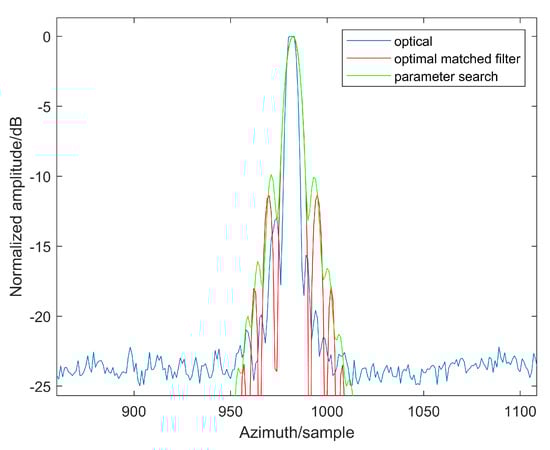 Furthermore, we explored the imaging of individual moving point targets through a parameter search approach. Following pulse compression in the range direction, a set of azimuth matched filters with varying quadratic coefficients were evaluated. The image with optimal imaging performance was chosen according to the maximum variance criterion, as depicted in Figure 13b. The associated variance is 7.7238 × 105, lower than that of Figure 9a. The azimuth profiles of the single-point target images obtained by optical method, optimal matched filter and parameter search approach are shown in Figure 14. The corresponding PSLRs are −12.98 dB, −11.33 dB, and −9.87 dB, respectively.
