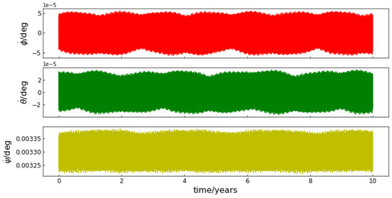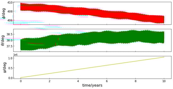 According to the established model, the initial Euler angles of Deimos at the J2000 epoch are provided by Brent et al. [32]. The integration of the established rotational differential equations using the ABM integration algorithm yields the results for the three Euler angles as shown in Figure 1 and Figure 2.